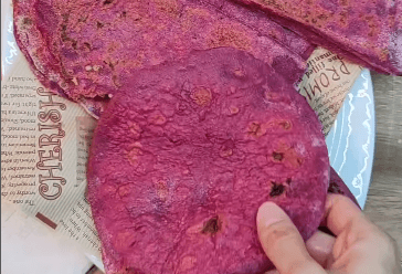 Ekmeklik çiğ karabuğday unu, sorgum unu ve kırmızı pancar ile pancarlı gözleme yapıyoruz