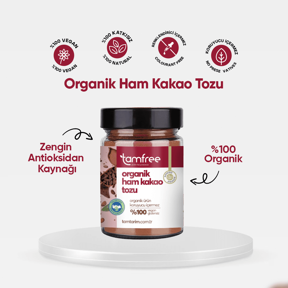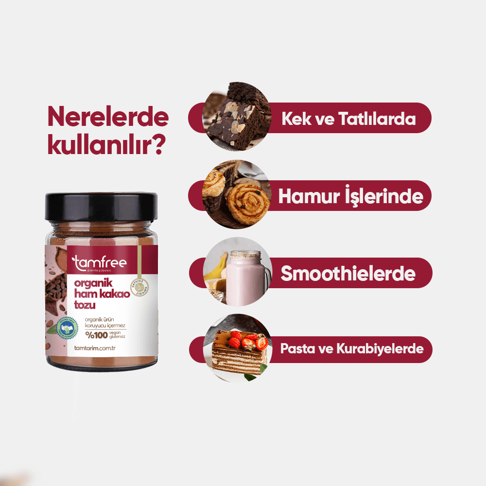 Ham kakao, glutensiz ve doğal olduğu için, sağlıklı diyetlerde ve tatlılarda tercih edilen bir bileşendir. İçeriğinde bolca antioksidan, vitamin ve mineral bulunur, bu da onu besleyici bir seçenek haline getirir. Ham kakao, yoğun ve bitter bir tada sahiptir ve çikolata yapımının temel maddesidir. Aynı zamanda kekler, tatlılar, smoothie’ler ve içeceklerde kullanılarak lezzetli ve sağlıklı bir alternatif oluşturur.