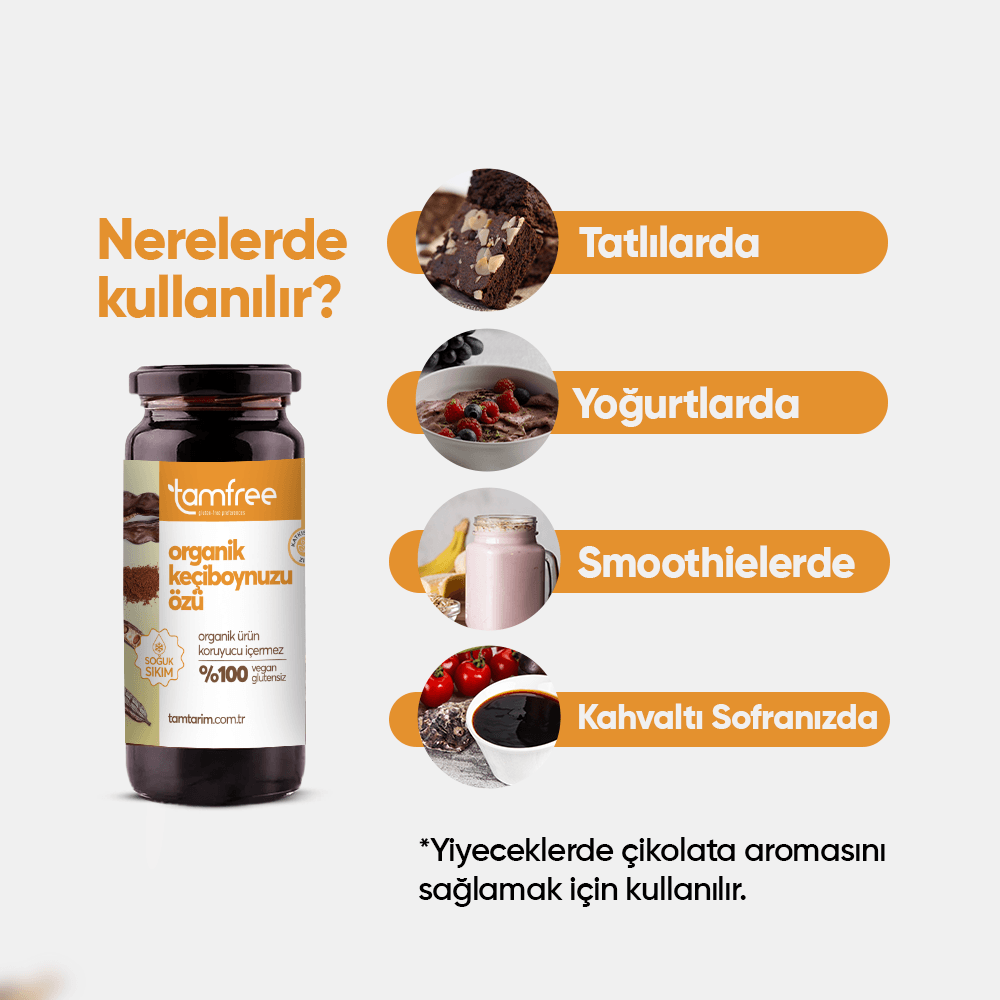 Keçiboynuzu özü, tatlılar ve içecekler için doğal bir tatlandırıcı olarak kullanılır. Ayrıca, %100 doğal ve glutensiz olması, onu çeşitli diyetlerde kullanılabilir kılar. Keçiboynuzunun doğal lezzeti, şeker yerine kullanılabilecek sağlıklı bir alternatif sunar. İçeriğindeki doğal şekerler ve lifler sayesinde enerji verir, fakat glisemik indeksi düşüktür.